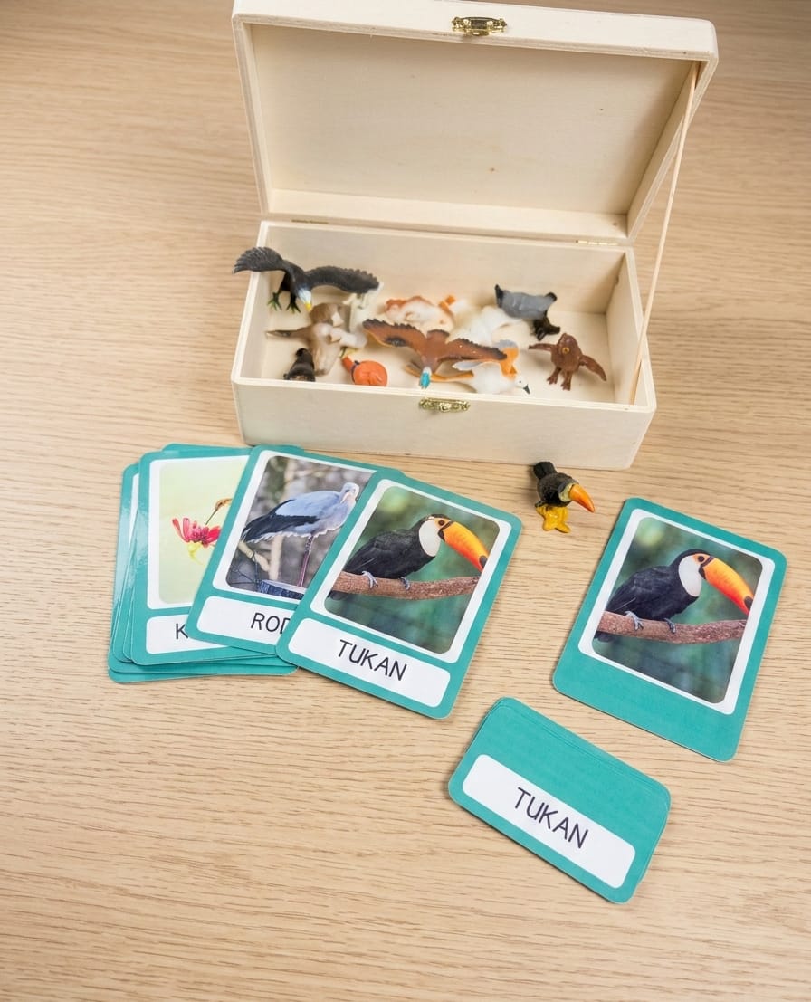 Prvi stupanj donosi kartice s fotografijom i nazivom ptice, pri čemu dijete promatra, sluša i povezuje sliku s riječju, stvarajući sigurne temelje znanja. U drugom stupnju nalazi se samo fotografija, što potiče dijete da samostalno prepozna i imenuje pojam te učvrsti svoje znanje. Treći stupanj sadrži samo naziv, a dijete povezuje napisanu riječ s odgovarajućom slikom, razvijajući čitalačke vještine, koncentraciju i sigurnost u vlastite sposobnosti.